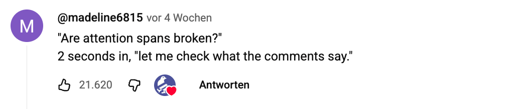 Das Team von Howtown guckt sich an, was die Wissenschaft über unsere Aufmerksamkeitsspanne herausgefunden hat. Vor allem die Untersuchungen dazu, was kurze, swipebare Videos mit uns machen, haben es in sich. Und ich liebe die selbstironischen Kommentare: